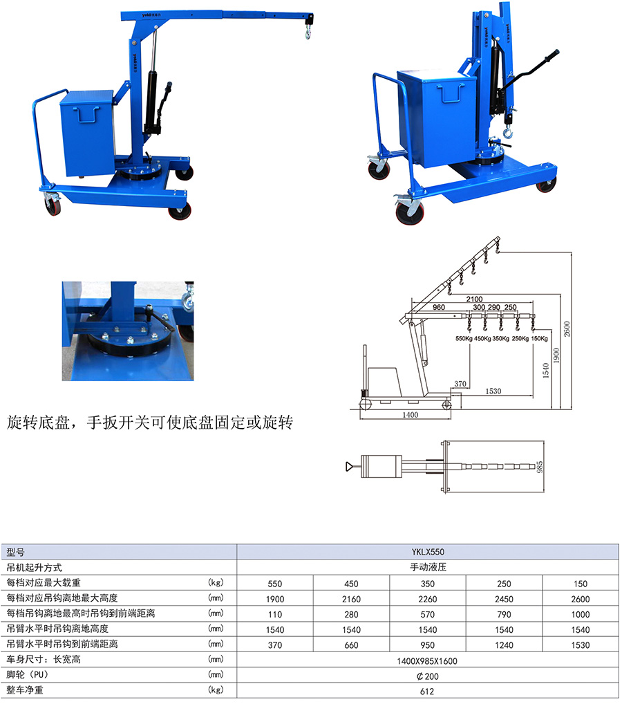 ● 吊臂長度可五工位手動調節(jié)配有鍛造重載可旋轉吊鉤。